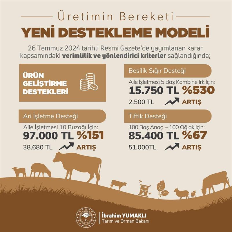 “Tarım ve Orman Bakanlığının “Planlı Üretim" kapsamında oluşturduğu yeni destekleme modelini içeren “2024-2026 yıllarında yapılacak Hayvancılık Desteklemelerine İlişkin Karar" Resmî Gazetede yayımlanarak yürürlüğe girdi. Yeni kararname ile ilk defa Destekleme Kararı 3 yıllık olarak çıkarıldı.