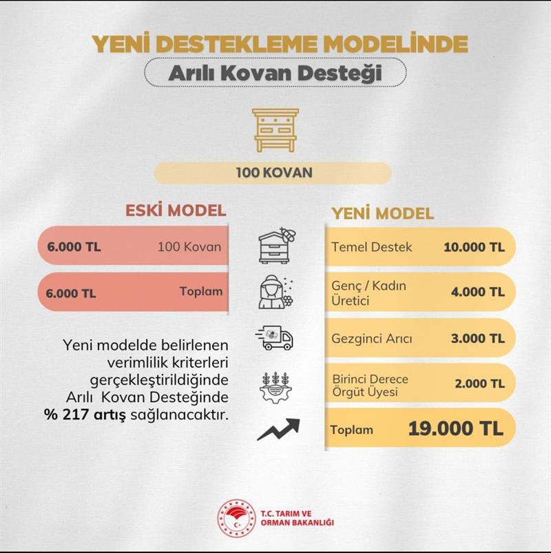 Şu anda 100 adet kovana sahip bir arıcı 6 bin TL destek alırken, yeni model kapsamında 10 bin TL temel destek, genç ve/veya kadın arıcı olması durumunda ilave 4 bin TL, gezginci arıcı olması durumunda ilave 3 bin TL, birinci derece tarımsal amaçlı örgüt üyesi olması durumunda ilave 2 bin TL olmak üzere toplam 19 bin TL desteğe ulaşabilecek.