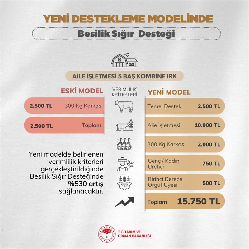 Halihazırda 5 baş kombine ırka sahip besicilik yapan bir aile işletmesi 300 kg karkas için 2 bin 500 TL destek alırken, yeni model kapsamında 2 bin 500 TL temel desteğe ilave olarak, 300 kg karkas olması durumunda 2.000 TL, aile işletmesi olması durumunda 10 bin TL, genç ve/veya kadın yetiştirici olması durumunda 750 TL, birinci derece örgüt üyesi olması durumunda 500 TL olmak üzere 15 bin 750 TL desteğe ulaşılacak.