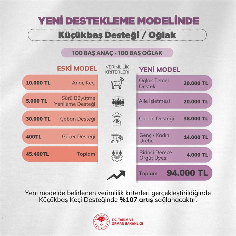 Mevcut durumda 100 baş anaç koyun varlığına sahip bir aile işletmesi; anaç koyun, sürü yenileme, göçer ve çoban desteği dahil toplam 45 bin 400 TL destek almaktayken yeni model ile bir aile işletmesi, işletmede doğan kuzular için kadın ve/veya genç yetiştirici, birinci derece örgüt üyesi olması durumunda çoban desteği ile birlikte toplam rakam 85 bin 200 TL 'ye çıkacak.