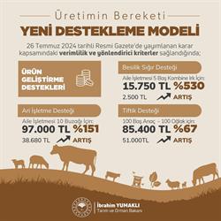 Daha önce verimlilik kriterlerini sağlayan bir aile işletmesi buzağı başına 2 bin 68 TL destek alırken yeni modelde temel ve ilave kriterleri karşılaması halinde bu destek 5 bin 700 TL' ye kadar çıkabilecek.