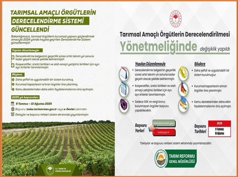 Bakanlığımız görev alanında bulunan 1163, 5996 ve 5200 sayılı Kanun hükümlerine göre kuruluşlarına izin verilen tarımsal amaçlı örgütleri ortak bir payda da buluşturmak, faaliyetlerin etkinliğini artırmak, teşvik etmek, desteklemek, ödüllendirmek ve ilgili kurumlar ile işbirliğini geliştirmek amacıyla Bakanlığımız tarafından hazırlanan, 28.11.2023 tarihli ve 32383 sayılı Resmî Gazete' de yayımlanarak yürürlüğe giren Tarımsal Amaçlı Örgütlerin Derecelendirilmesine ilişkin Yönetmelik ile 08.07.2025 tarihli ve 32950 sayılı Resmî Gazete' de yayımlanarak yürürlüğe giren Tarımsal Amaçlı Örgütlerin Derecelendirilmesine İlişkin Yönetmelikte Değişiklik Yapılasına Dair Yönetmelik kapsamında; Tarımsal amaçlı Örgütlerin Derecelendirilmesi Sistemine (TODES) başvurular 9 Temmuz- 10 Ağustos tarihleri arasında tarımsal amaçlı örgüt temsilcileri tarafından e-Devlet üzerinden yapılacaktır.