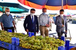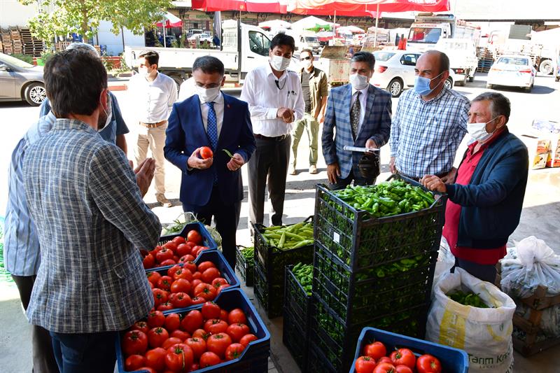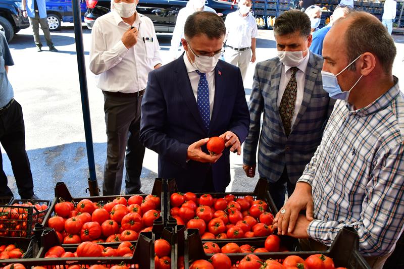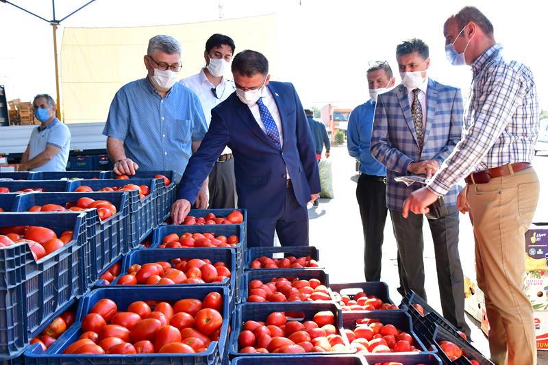 bilgi alan Vali Dr. Ozan Balcı, zengin çeşidiyle tezgahları süsleyen domates,