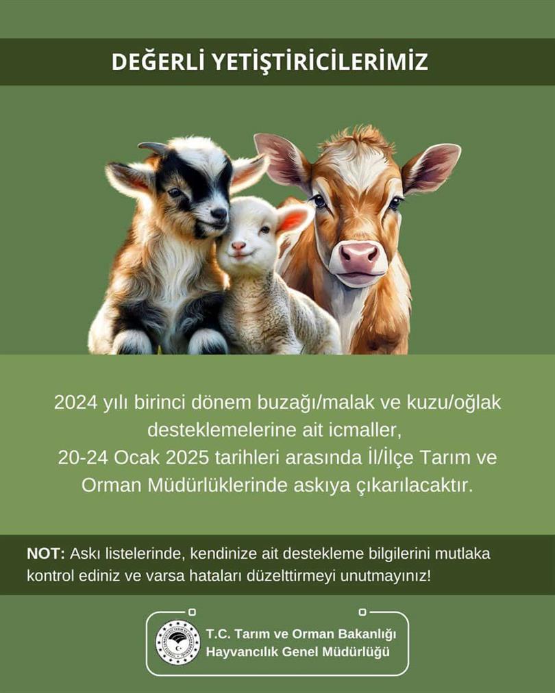 25/7/2024 tarihli ve 8760 sayılı Cumhurbaşkanı Kararı ile yürürlüğe konulan 2024-2026 Yıllarında Yapılacak Hayvancılık Desteklemelerine İlişkin Kararı gereği yayımlanan 2024 yılı Hayvancılık Desteklemeleri Uygulama Tebliği kapsamında işlem yapılan, 2024 Yılı doğummlu Buzağı, Malak, Kuzu , Oğlak 1. Dönem Destekleme Lİsteleri İl ve İlçe Müdürlüklerimizde 20.01.2024-24.01.2024 tarihleri arasında askıya çıkarılmıştır.